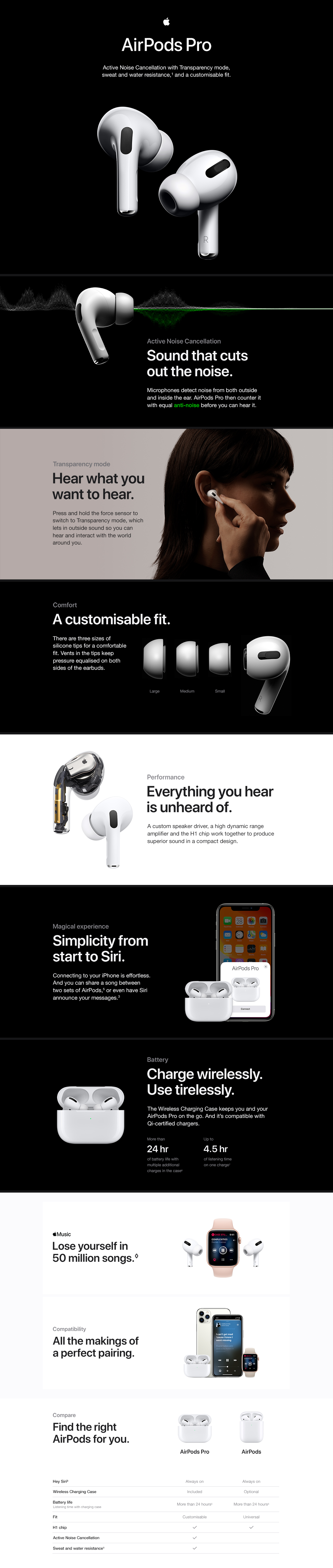 AirPods Pro feature Active Noise Cancellation for immersive sound. Transparency mode for hearing the world around you. They’re sweat and water resistant,1 and have a customisable fit for all-day comfort.